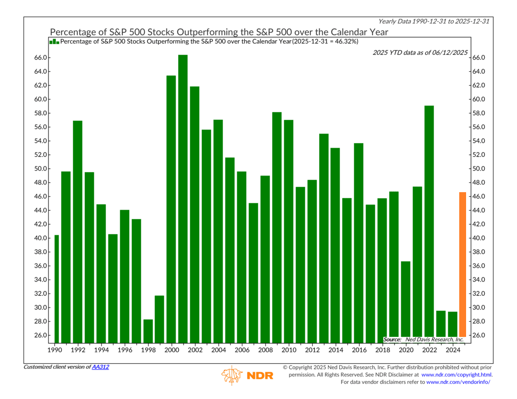 But this year looks different. We had a hiccup back in April, but since then, the market has recovered. As of June 12, roughly 46% of S&P 500 companies have outpaced the index’s 1.8% year-to-date gain—much closer to the long-term average of 48%.