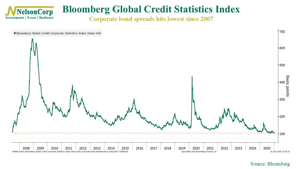 As you can see, those spreads are very tight right now. They are currently near the lowest level we’ve seen in roughly 20 years. Investors are only demanding about 100 basis points, or 1 percentage point, of extra yield to invest in corporate bonds instead of government bonds.