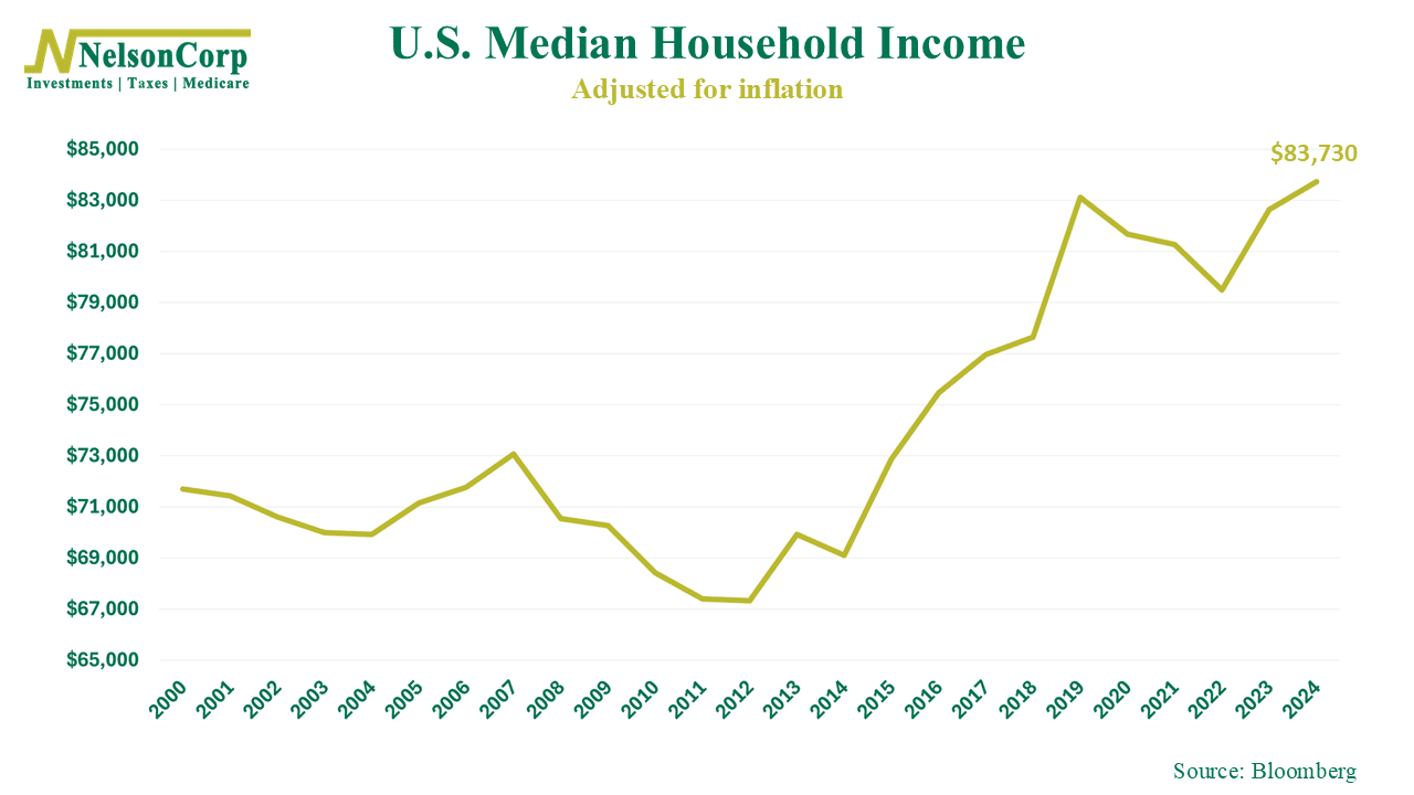 As we head into Thanksgiving and the holiday season, it’s worth pausing to look at a piece of good news that doesn’t always make the headlines. As this week’s chart shows, real median household income in the U.S. climbed to $83,730 last year, the highest level on record after adjusting for inflation.