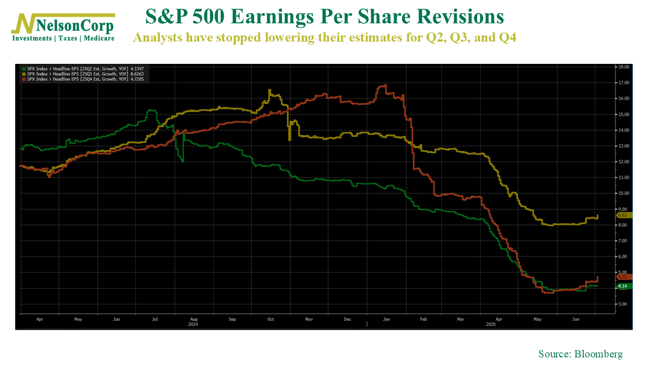 Each line in the chart tracks the year-over-year growth forecast for earnings in Q2, Q3, and Q4. You can see how sharply expectations were lowered earlier this year — especially as headlines around tariffs rattled the market.