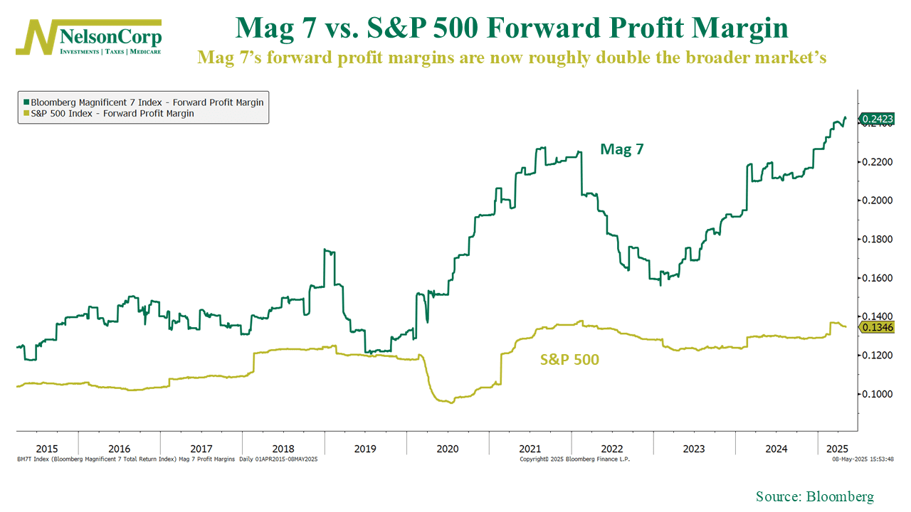 As of April 2025, the collective forward profit margin for the Mag 7 has reached an all-time high of over 24%. That’s roughly double the 13% forward profit margin of the S&P 500 as a whole.