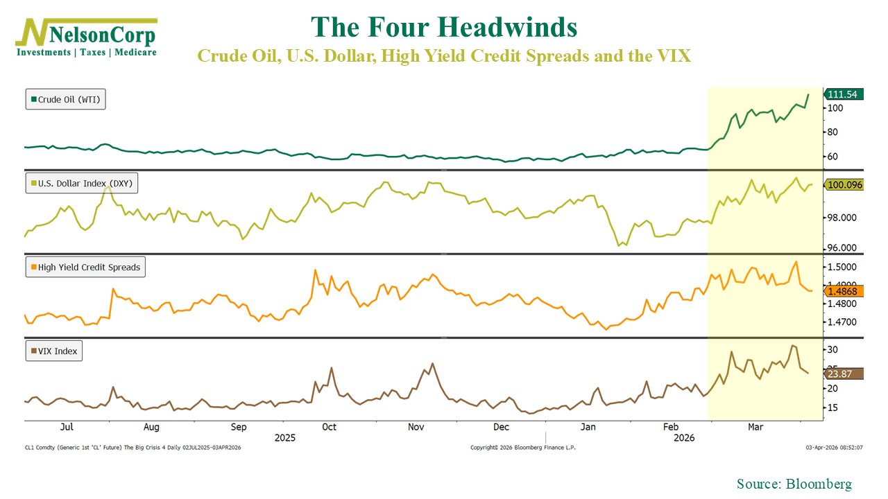 Here’s why this matters for your portfolio. Each of these four things, on its own, can weigh on stocks. Higher oil prices squeeze consumers and businesses. A stronger dollar hurts earnings for U.S. companies that sell overseas. Wider credit spreads mean it’s getting more expensive for companies to borrow money. And an elevated VIX just reflects the fact that investors are nervous and demanding more protection. When all four are moving against you at once, the market tends to struggle—which is pretty much what we’ve seen over the last several weeks.