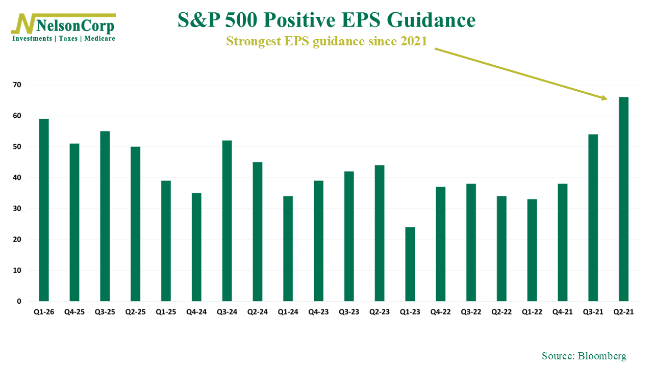 But right now, something different is happening. As this week’s chart shows, 66% of S&P 500 companies have issued positive EPS guidance heading into the quarter—meaning they’re actually raising their own bar. That’s the highest reading in five years and well above the historical average of around 42%.