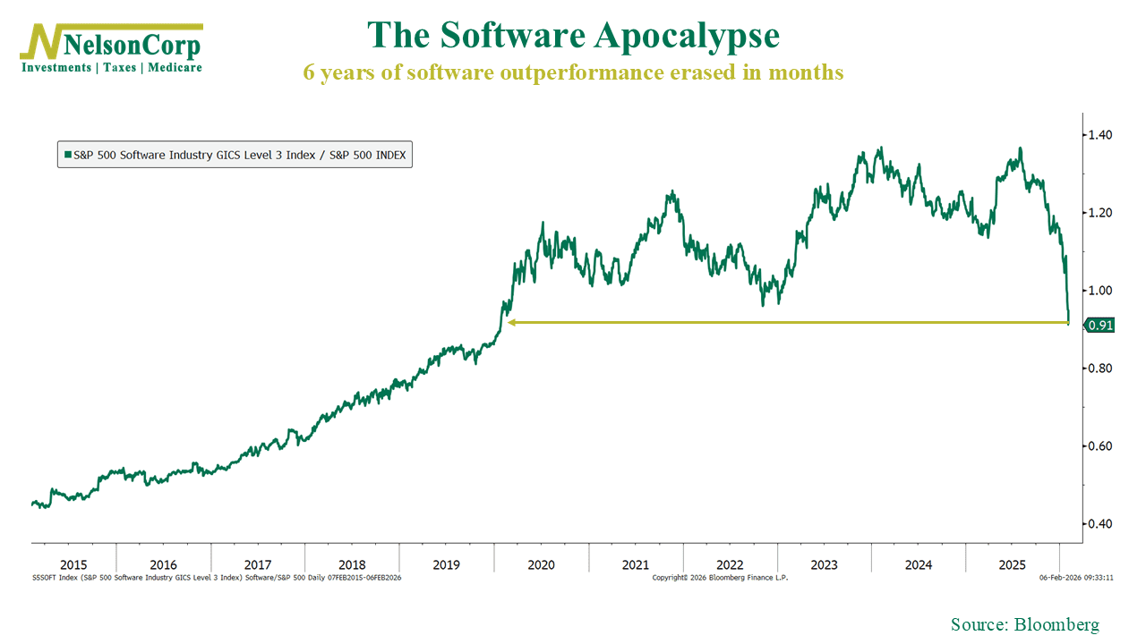 It’s a valid concern. But what’s notable is that, despite the carnage in the software sector, the broader market has held up relatively well. Investors aren’t really panicking about the economy, per se, or corporate profits. Instead, this looks more like a rotation. Money is moving away from parts of the market facing disruption and into areas that benefit from AI investment.