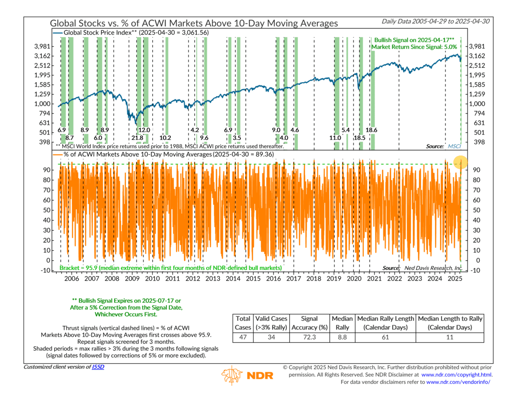 As you can see in the chart, this measure of global breadth dropped all the way to 0% on April 8th. But just nine days later, it shot up to 100%. In other words, every single stock market in the MSCI All-Country World Index was trading above its 10-day average. That’s rare—and impressive.