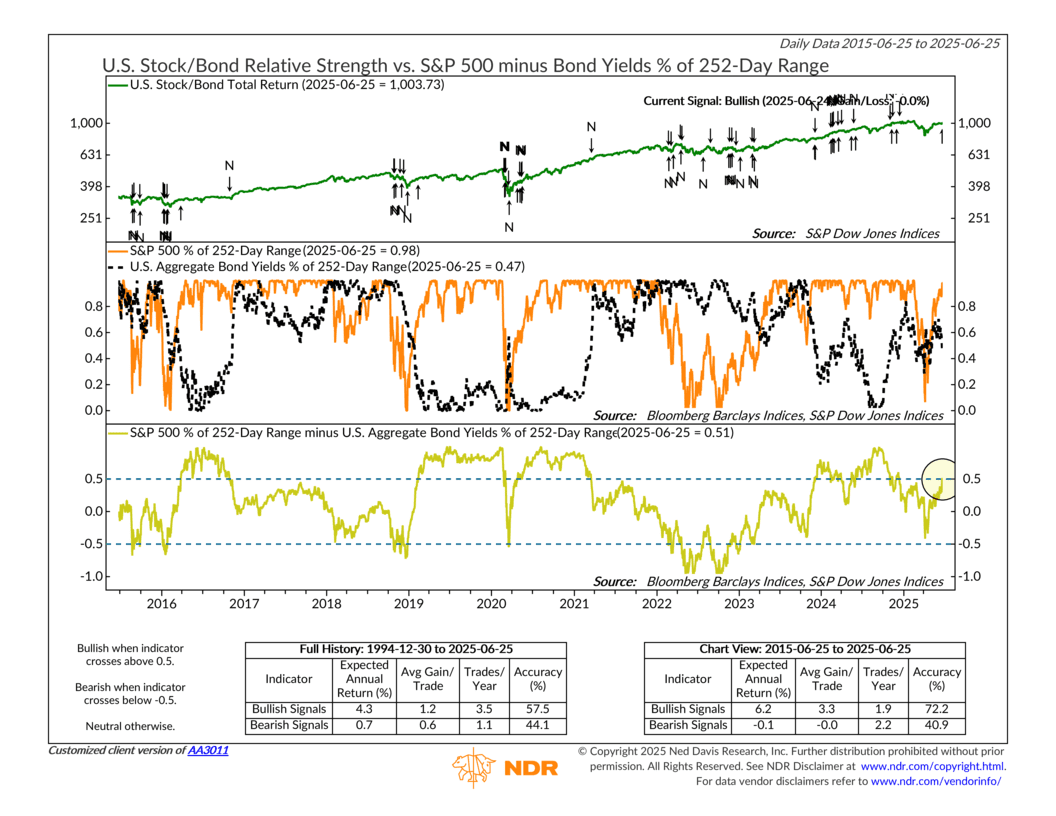As of June 25, the indicator just flipped bullish, crossing above the +0.5 threshold with a reading of +0.51. That suggests stocks are gaining ground faster than bond yields, a positive sign for risk assets and a potential shift in momentum.
