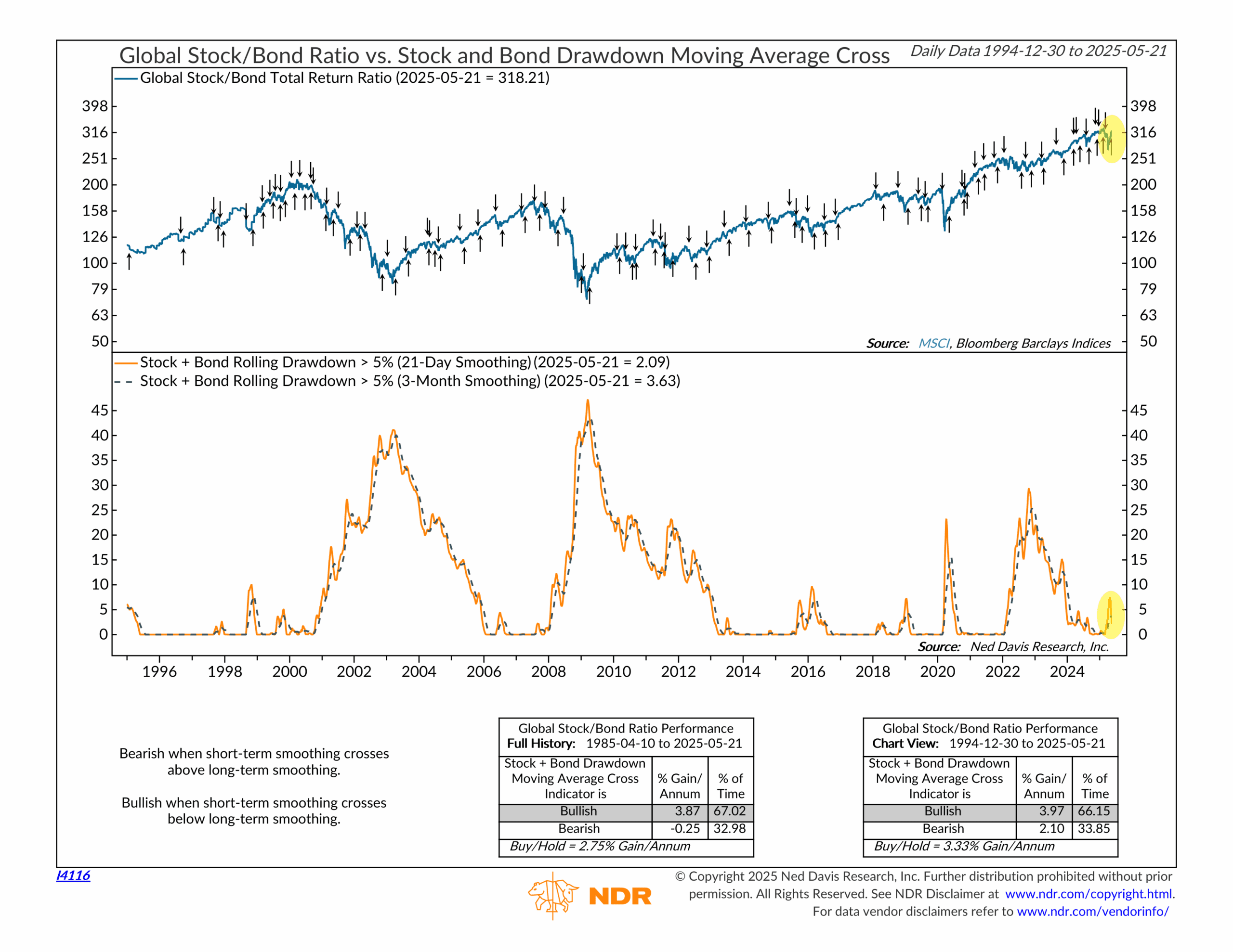 Now take a look at the bottom half of the chart. That’s our indicator. It tracks the trend of the combined rolling drawdown in stocks and bonds when losses exceed five percent. The signal turns bullish when the short-term (21-day) smoothing drops below the long-term (3-month) smoothing—and turns bearish when the short-term crosses back above.
