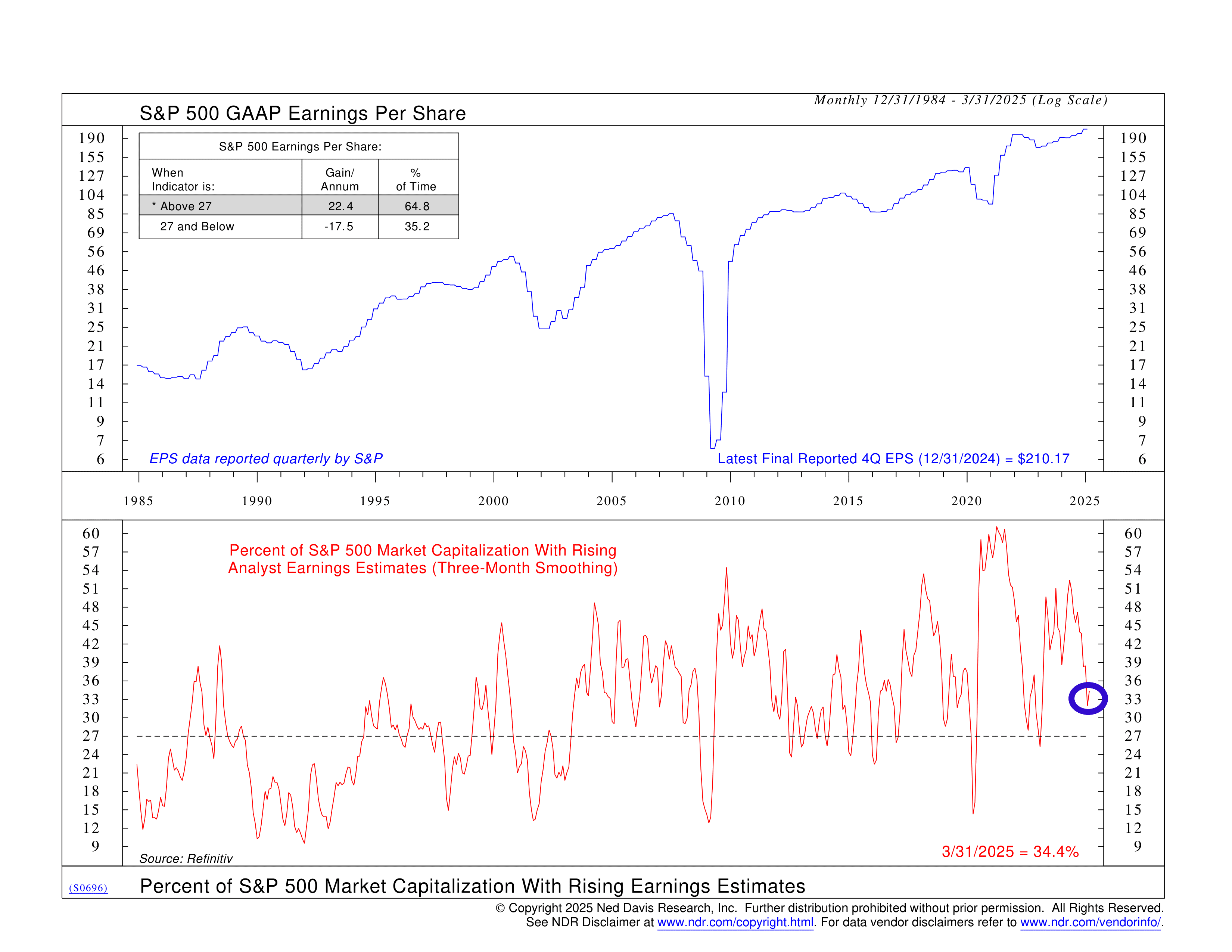 Take a look at the lower section of the chart. The red line shows the percentage of S&P 500 market cap seeing estimate upgrades, smoothed over three months to reduce the noise. It was around 47% last fall, but as of March 31st, it’s dropped to just 34.4%. That means only about a third of the market is getting upgraded, while the rest is either flat or being marked down. That’s a meaningful decline. Historically, once this measure dips below 27%, things tend to get dicey for earnings growth and, often, for the market as a whole.