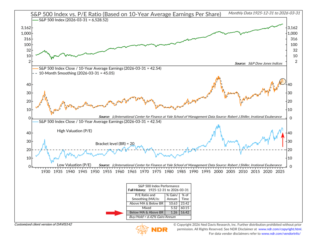 Well, the CAPE currently sits at 42.54 — levels only seen during the late 1990s dot-com bubble and the post-Covid bull market. Oh, and it has recently slipped below its 10-month smoothing average of 45.05. In other words, it’s expensive and rolling over.