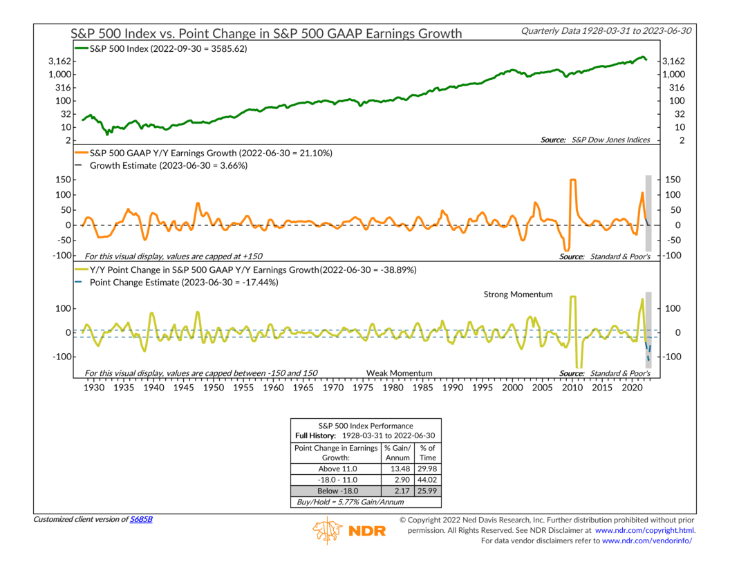 This is important because the historical data show that the stock market performs the best—over 13% per year—when the year-to-year percentage point change in earnings growth is accelerating faster than about 11 points. Between -18 and 11 points, the market only returns about 2.9%, on average. And when the change in earnings growth is less than -18 percentage points, the market declines in value by about 2% per year.