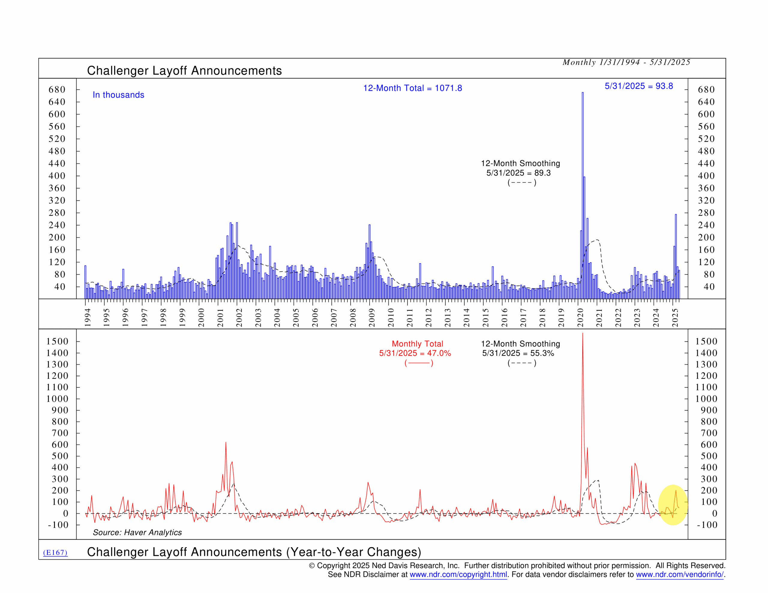 The bottom chart shows the year-over-year change in layoffs. This is the key part of the indicator that we focus on. May’s total was 47% higher than a year ago. Smooth that by 12 months, and you get a number that is well above zero—a bearish sign for equites. That’s because this kind of acceleration often shows up before broader labor market data starts to weaken—such as unemployment and payrolls.