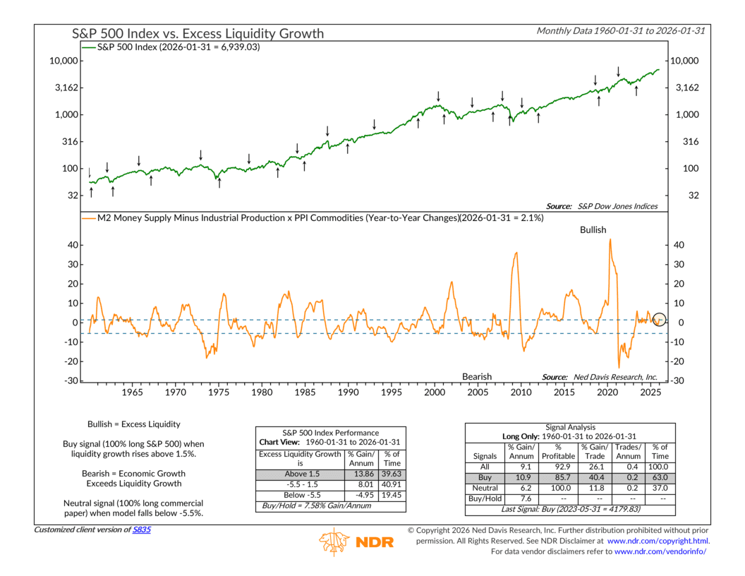But last month’s update to the chart suggests otherwise. As you can see, while industrial production and commodity components have been firm, M2 growth has accelerated even more. As a result, excess liquidity has moved back above the bullish threshold. The indicator now sits at +2.1%, firmly in bullish territory.