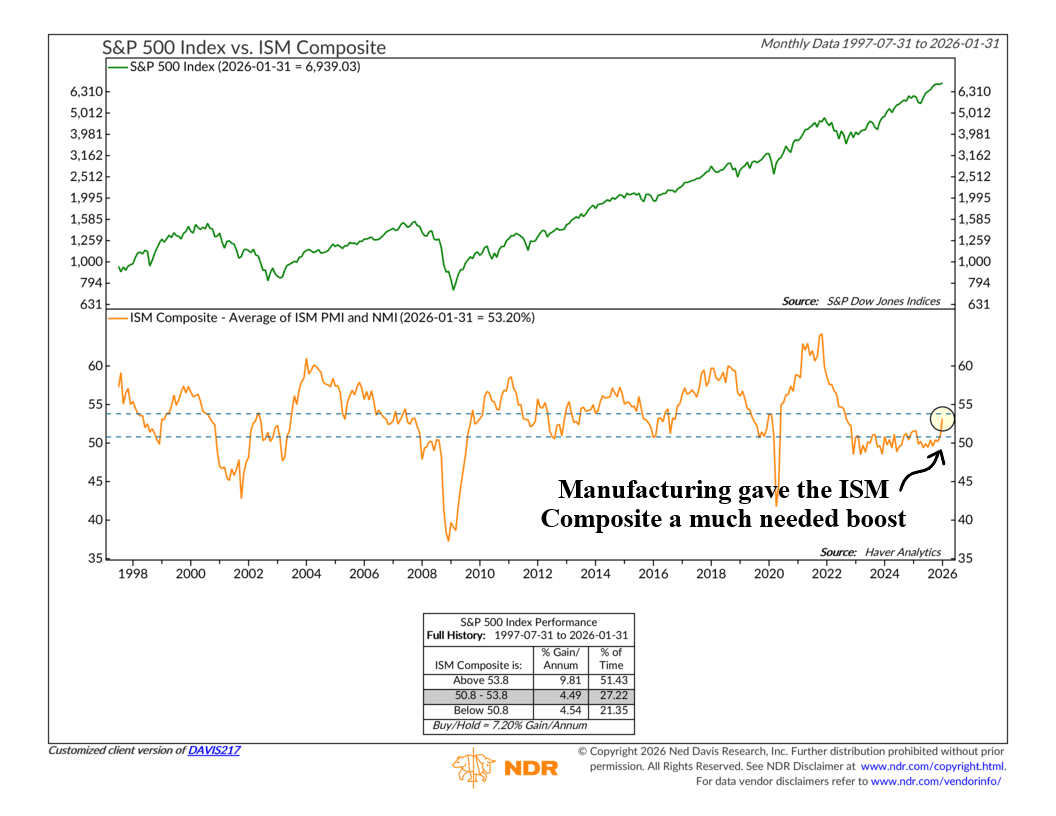 Why is this important? Because the manufacturing index is one of two inputs in our featured indicator (shown above), the ISM Composite. The ISM Composite simply combines the ISM Manufacturing index and the Non-Manufacturing (Services) index into one reading to help call the stock market.