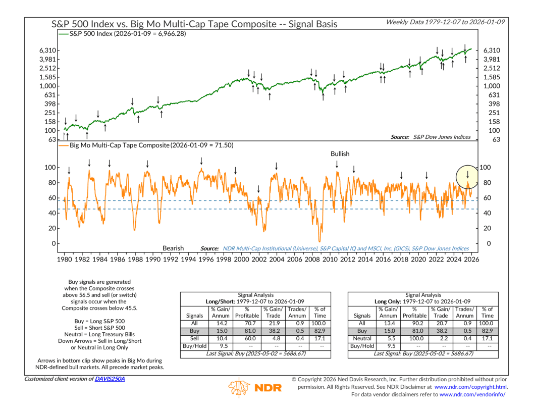 One of the best, most reliable indicators we have to measure momentum is the indicator shown above: NDR’s Big Mo Multi-Cap Tape Composite. We call it Big Mo for short. At a high level, Big Mo is designed to capture broad-based market momentum across market caps. It’s not really trying to time short-term pullbacks. Instead, it measures the strength and persistence of trends, which makes it especially useful for understanding where we are within a broader market cycle.