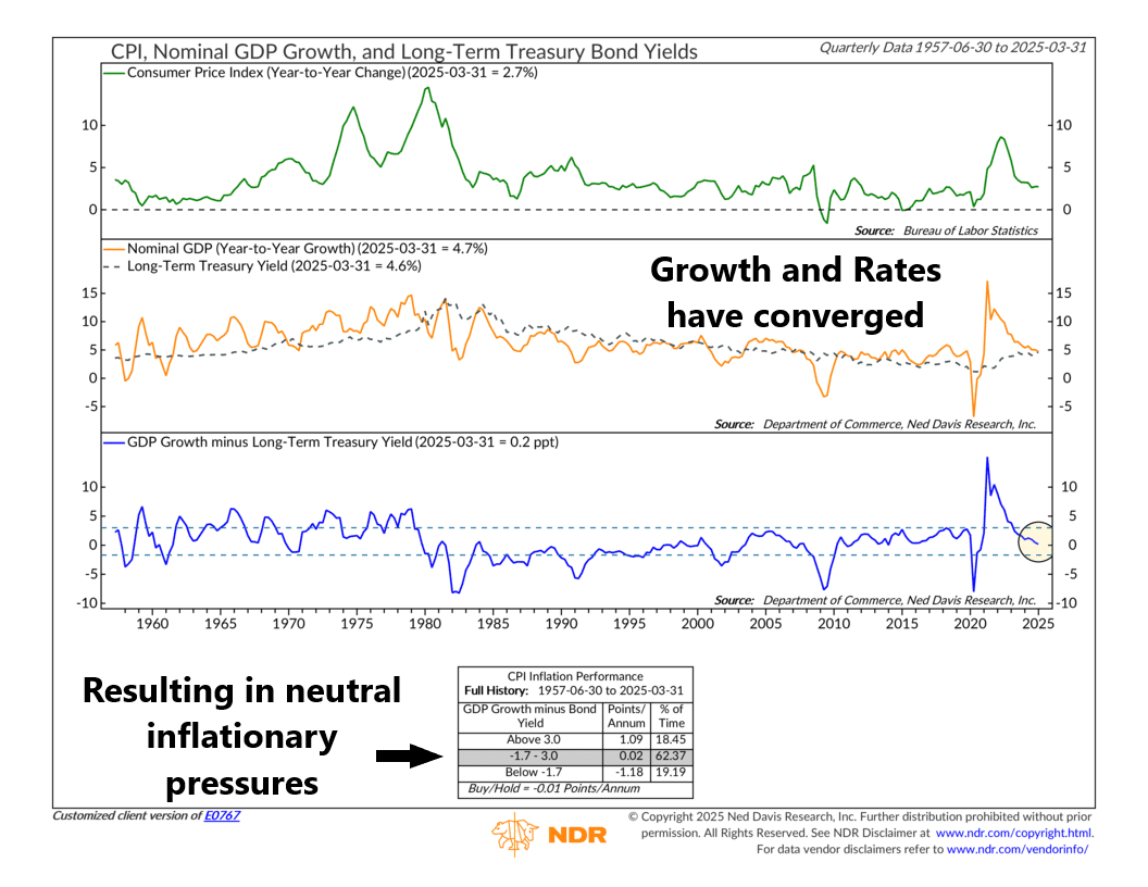 Historically, this indicator has operated within three general zones. When GDP growth outpaces yields by more than three percentage points, inflation tends to rise. When the spread drops below -1.7 percentage points, inflation tends to fall. In between—where we are now—the signal is neutral. Not too hot, not too cold.