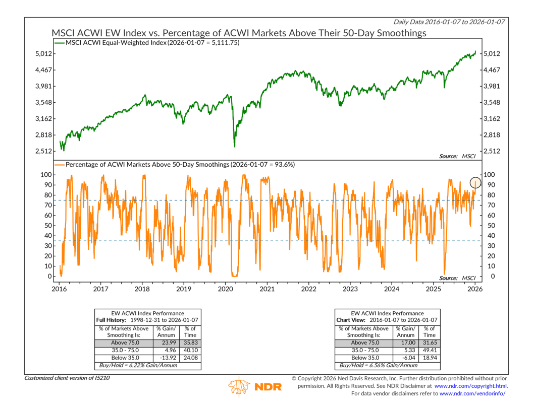 To start the new year, participation has surged. As I’ve highlighted, roughly 94 percent of ACWI markets are now trading above their 50-day moving averages. That’s a sharp and decisive move higher, especially given where it was late last year. This tells us this rally is no longer being carried by a narrow group of markets. Strength has broadened out meaningfully across regions and countries.