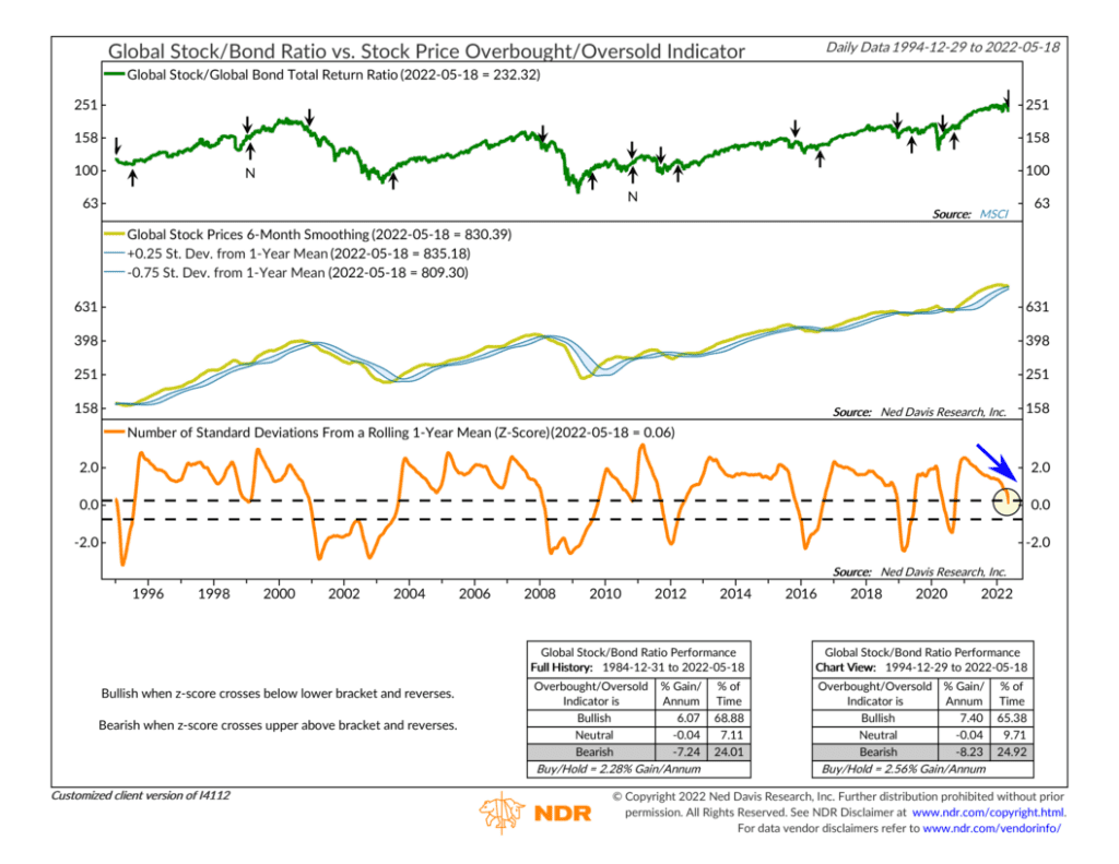 The performance boxes show that returns for the global stock/bond ratio (green line, top clip) have come in negative after a sell signal from this indicator. Returns after positive signals, however, have been much better.