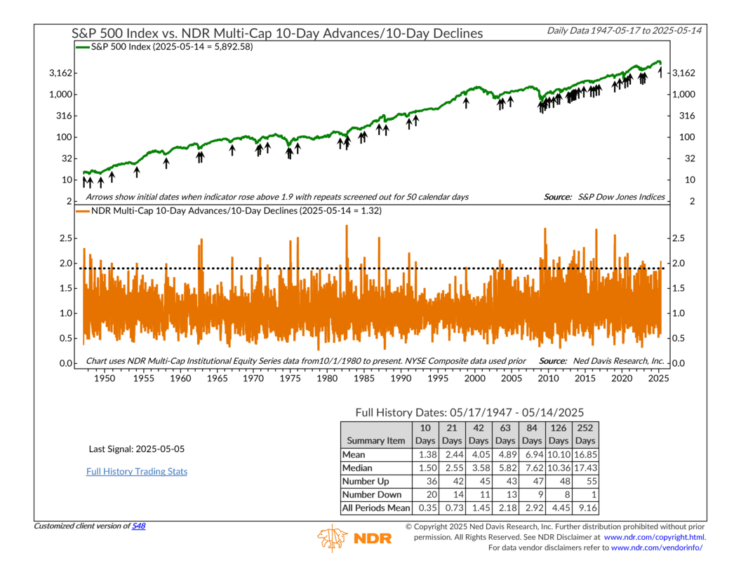 The key insight? When advancing issues outnumber declining ones by a wide margin over a 10-day stretch, it tends to signal a meaningful shift in market momentum—and historically, it’s often been followed by further gains.