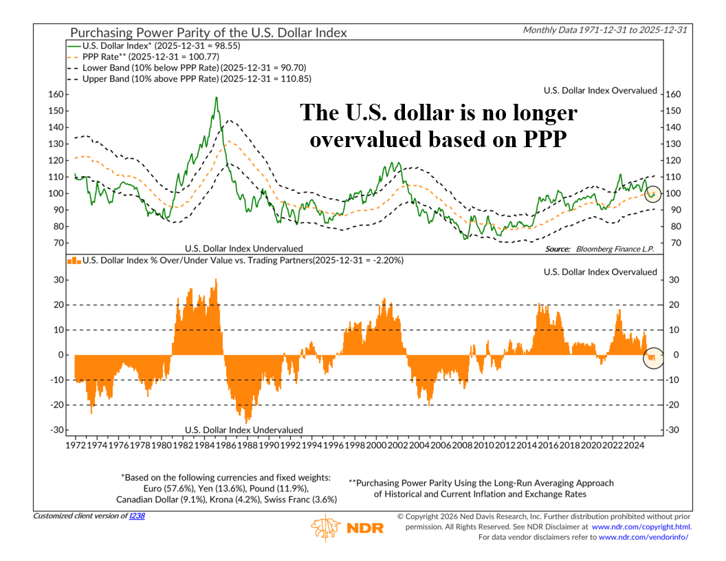 To judge whether the dollar is stretched, this indicator uses something called purchasing power parity, or PPP (orange line, top clip). The basic idea is simple. Over long periods of time, exchange rates tend to move in a way that reflects differences in inflation. If prices rise faster in one country than another, the currency of the higher-inflation country should eventually weaken to keep purchasing power roughly in balance.