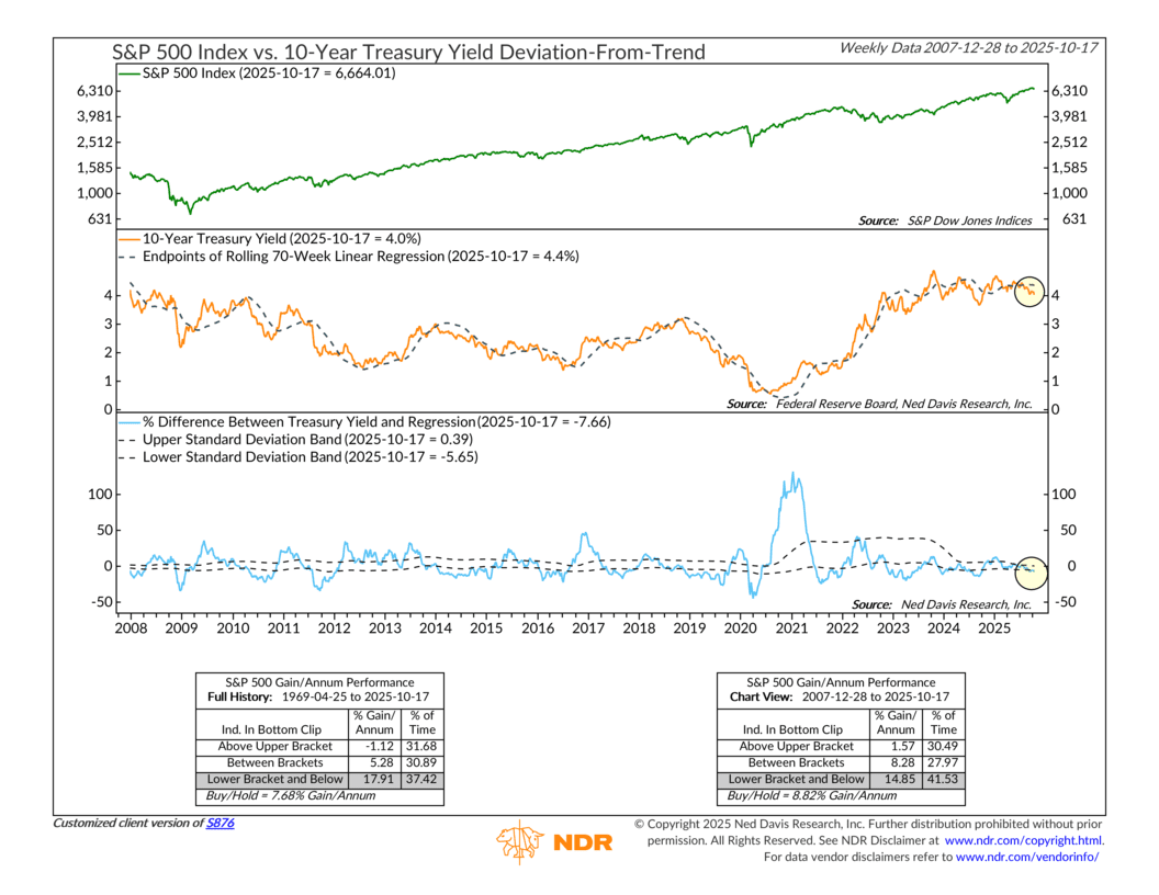 According to the long-term data, when yields sit at or below the lower bracket—as shown in the table at the bottom—the S&P 500’s average annualized gain has been roughly 15% to 18%, far stronger than periods when yields are elevated or above trend. In other words, markets tend to do best when rates are falling but the economy isn’t—and that’s exactly what we’ve been experiencing.