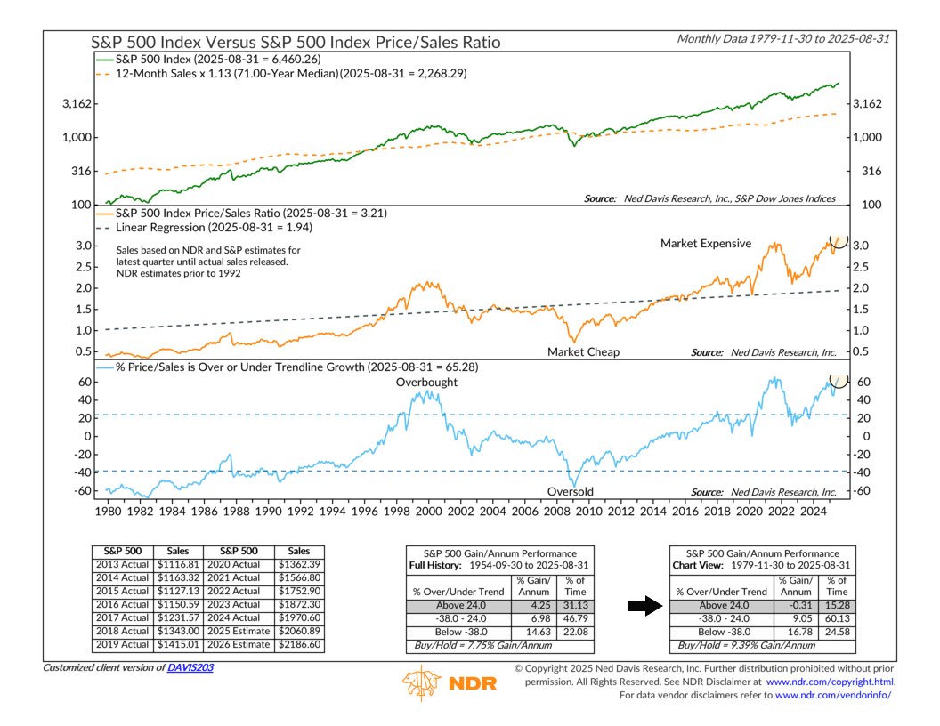 As you can see, it’s near its highest level ever—meaning the market is very much overvalued relative to sales. And that’s worrisome because, as the performance box shows, historically, when this measure of market valuation is above 24 (it’s at 65 right now), the stock market has had negative returns on average going back to 1979.