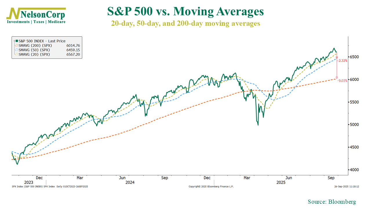 On the other hand, though, it’s still hard to see any material breakdown in the market’s actual price action right now. Sure, we had three straight down days last week, and the S&P 500 came close to crossing below its 20-day average price. But still, that’s the 20-day average we’re talking about here. As this next chart shows, the S&P 500 would need to drop another 2.5% to reach its 50-day average price, and more than 9% to reach its 200-day average price.