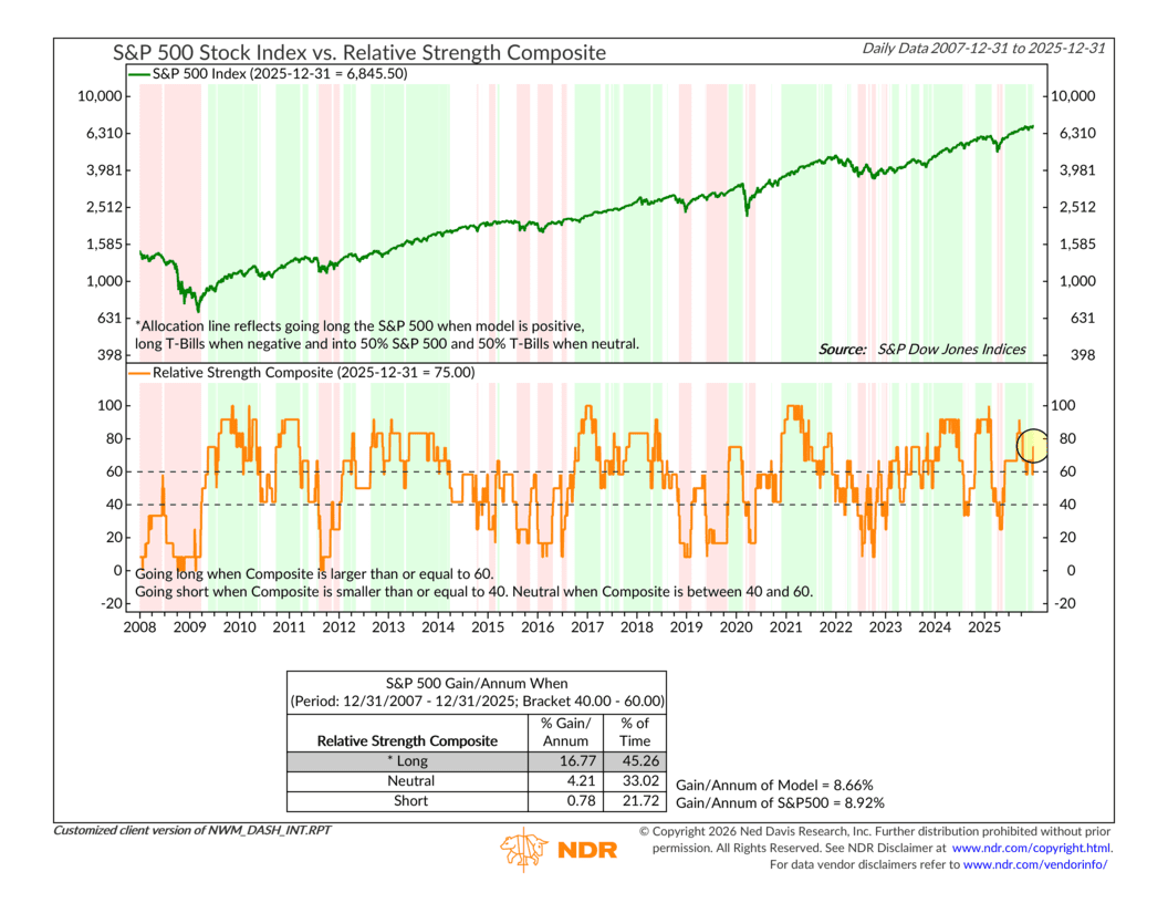 To begin with, relative strength has improved in favor of stocks. Our Stock/Bond Trend Model, which combines several trend and momentum indicators based on the stock-to-bond ratio, has climbed to a 75% bullish reading for equities. That improvement has helped push our broader Relative Strength Composite, shown below, back into bullish territory.