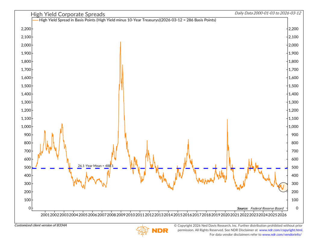 One area we’re paying particularly close attention to is credit spreads. This refers to the difference between yields on high-yield bonds, which carry more risk, and safer U.S. Treasury bonds. At the moment, that spread sits around 286 basis points and has been moving higher.