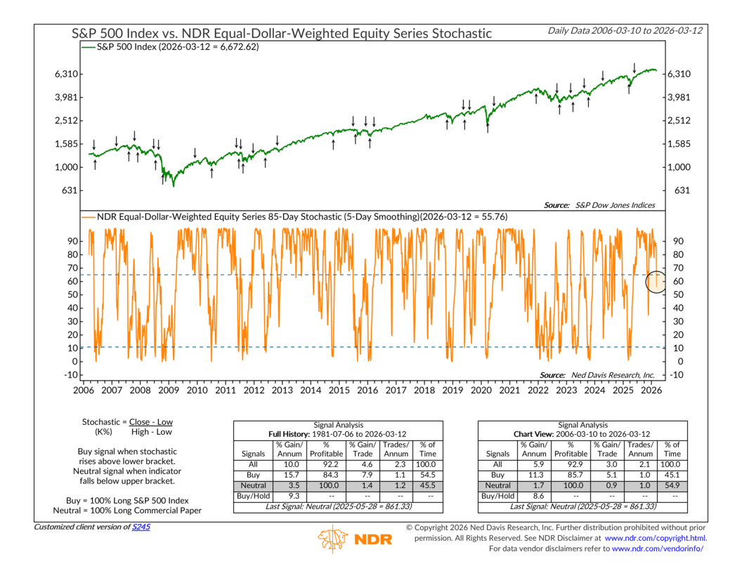 As for our risk models, they’ve been sniffing out market weakness for several weeks now. I’ve discussed this in past commentaries, but last week we finally got the sell signal we were waiting for from one of our key momentum indicators, the 85-day stochastic, shown below.