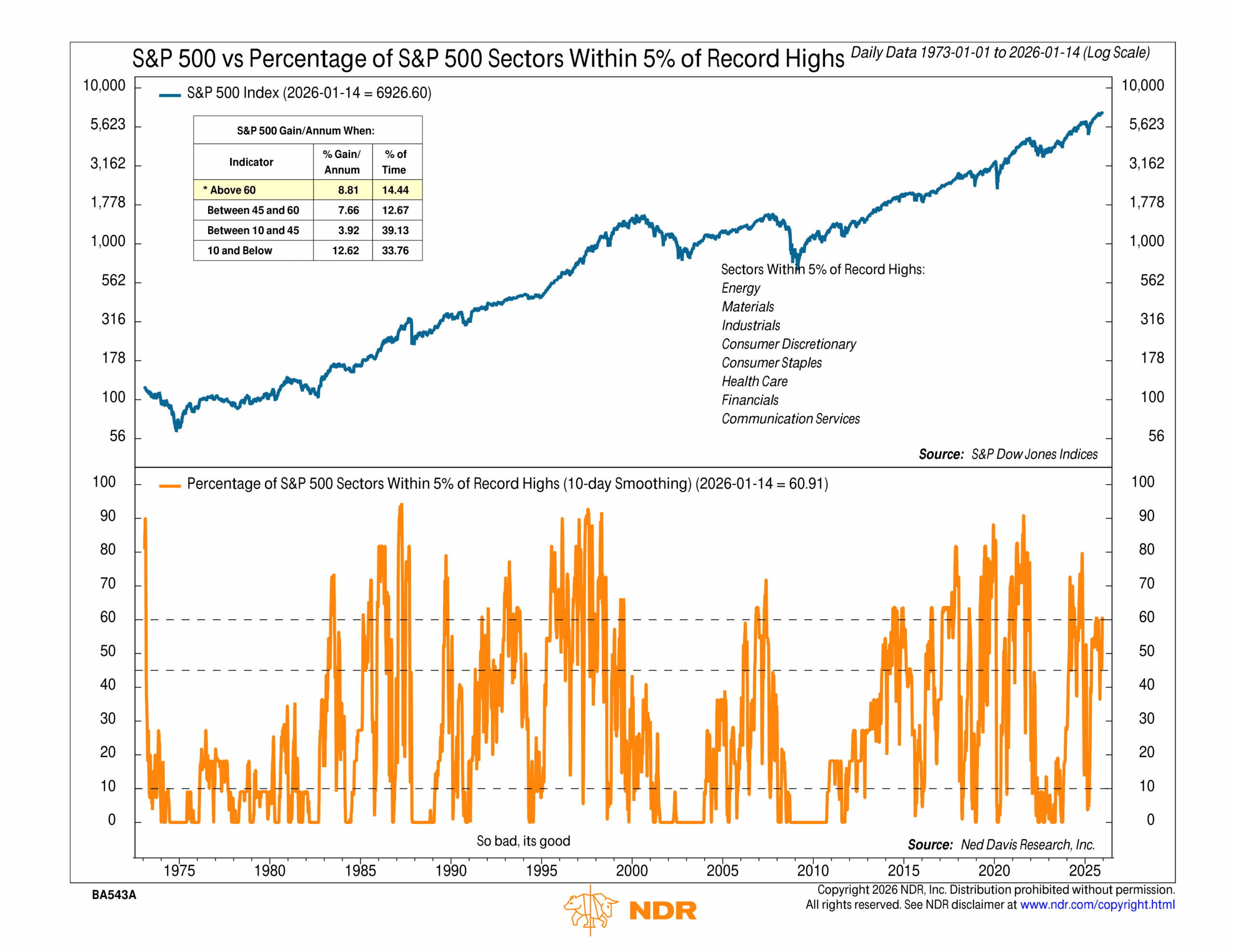 Right now, that figure sits around 61%, which works out to eight sectors. That’s a healthy number. As the performance box at the top of the chart shows, when at least that many sectors are participating, the overall index has gone on to produce an average annualized gain of nearly 9%. That’s the second-best return bucket for this indicator. The only scenario with better returns is when fewer than 10% of sectors are near highs, and that’s typically because markets are so oversold that forward returns improve from deeply depressed levels.