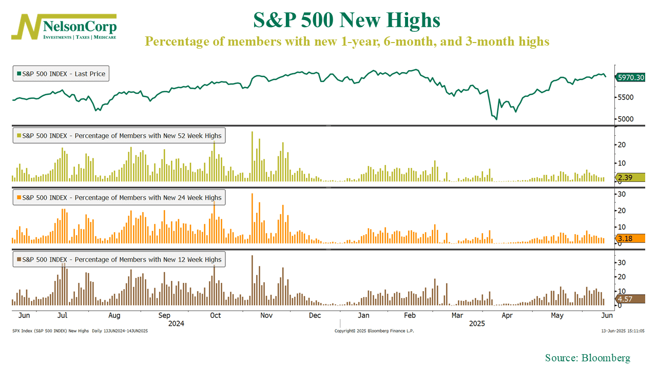 As you can see, while it’s elevated from the April lows, we still have a ways to go before we reach the levels from last year, when roughly 20–30% of stocks were consistently hitting new 1-year, 6-month, and 3-month highs.