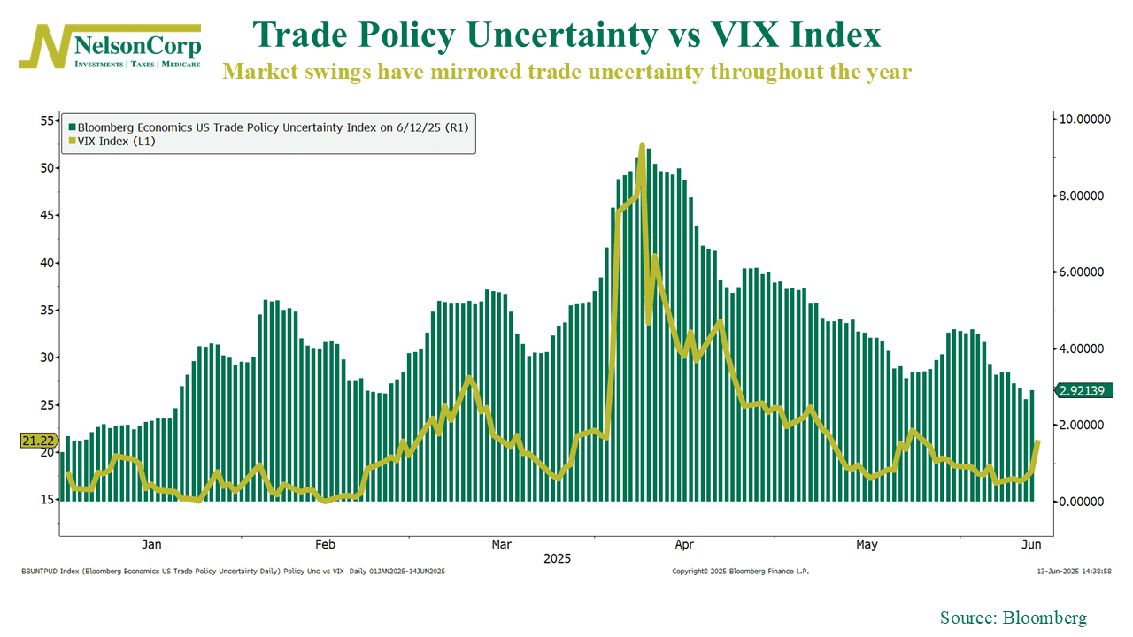 But at the end of the day, the theme for the market this year has been trade uncertainty. Any news—positive or negative—on trade has really moved the market. In fact, as this final chart shows, market volatility (the VIX Index) has moved in lockstep with the Bloomberg U.S. Trade Policy Uncertainty Index this year.