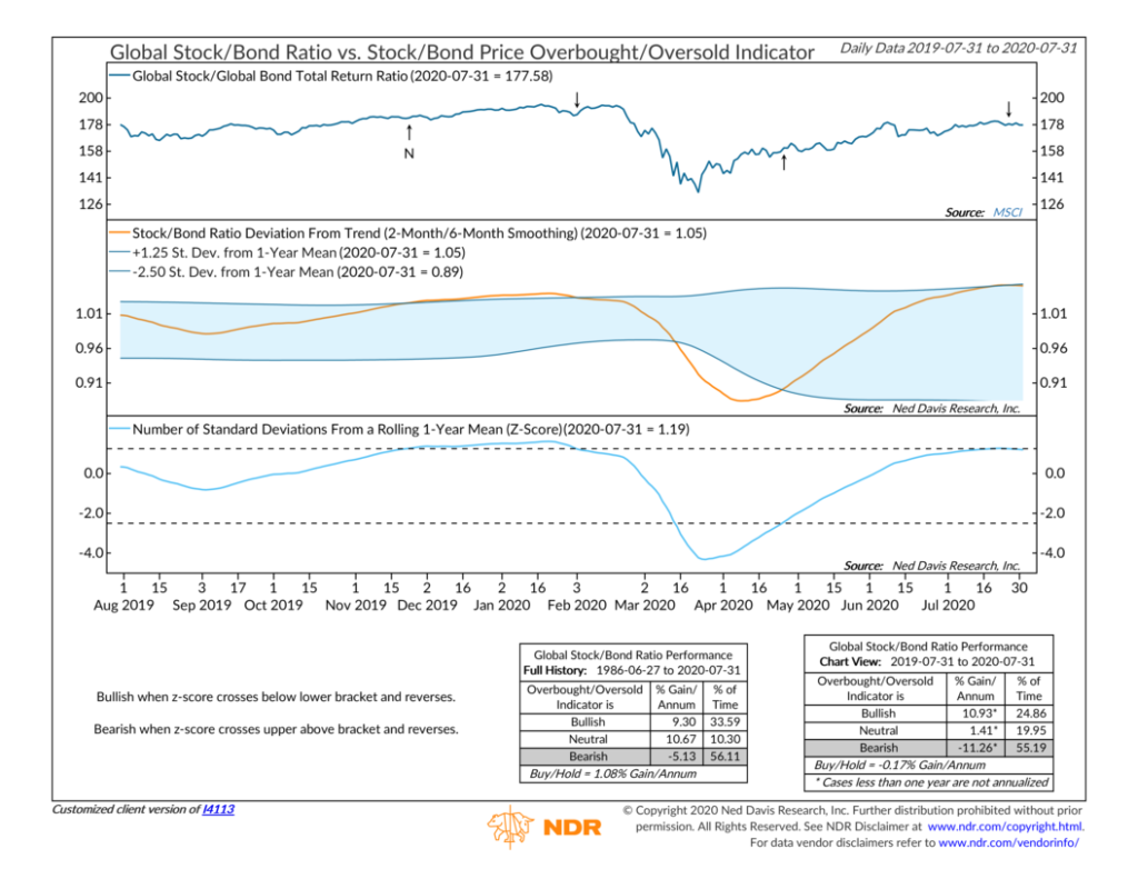 On the other hand, while things look bullish for the U.S. stock market, there are signs that global stocks have reached overbought levels compared to bonds.