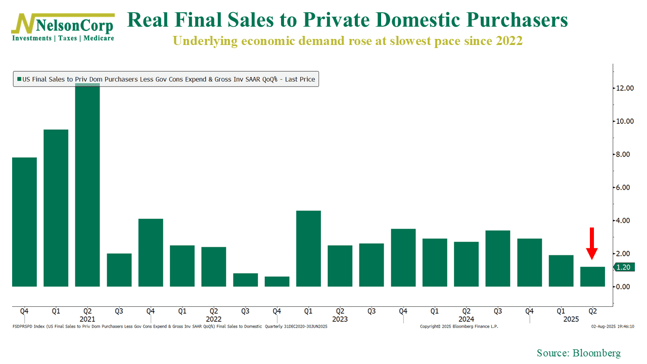 Of course, one area causing confusion at the Fed is economic growth. Is it strong or weak? Well, from a headline GDP point of view, growth still looks solid. It increased at a 3.0% annualized rate last quarter. But under the hood, things look a little softer. One key measure—real final sales to private domestic purchasers, shown below—came in weaker, hinting that consumer and business demand isn’t quite as strong as the GDP number suggest.