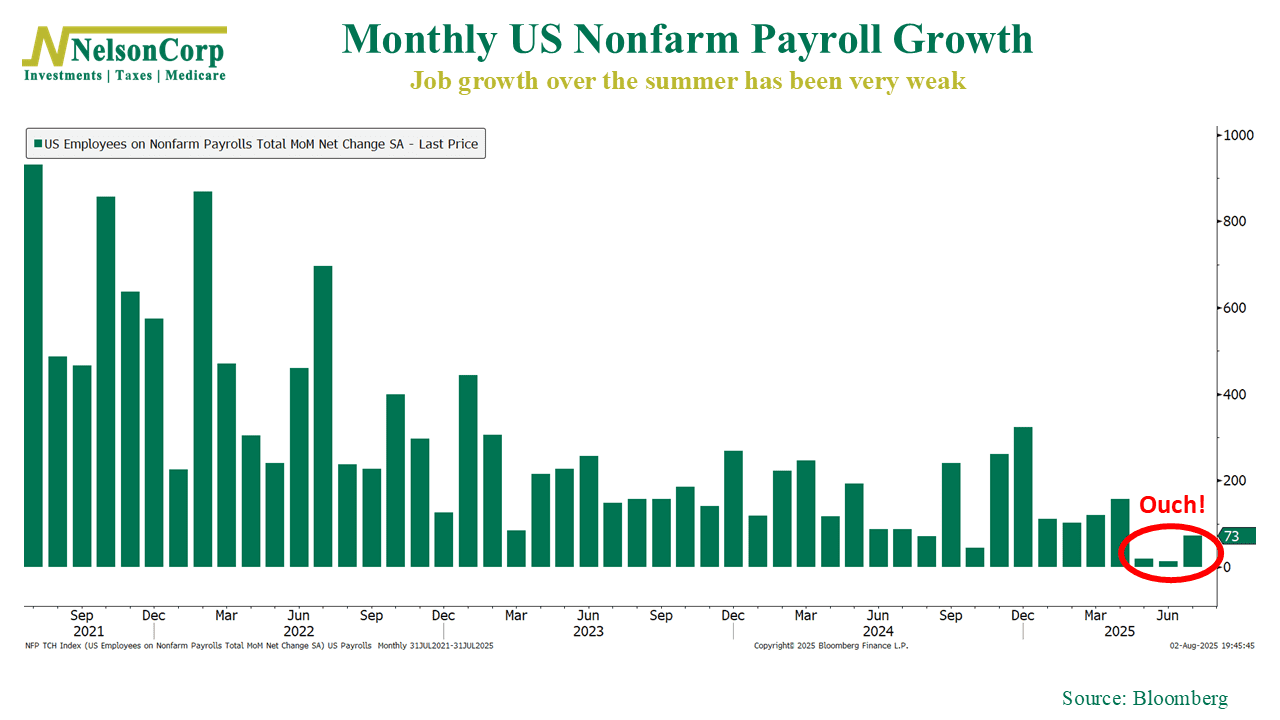 And then there is the labor market. We got a pretty big stinker of a jobs report last Friday. We only added 73,000 jobs in July, below expectations of more like 100,000. And the even bigger concern was the revisions to the May and June jobs numbers. They were revised lower to just 19,000 in May and just 14,000 in June.