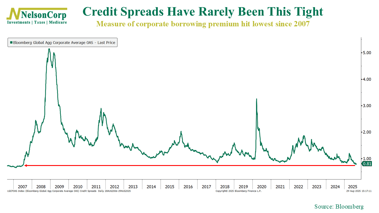 Still, valuations aren’t the only thing worth watching. Beyond prices, we do see some evidence of investor complacency. Implied volatility, as measured by the VIX, is very low. And as this final chart shows, credit spreads—the extra yield investors demand for holding corporate bonds instead of government bonds—are as tight as they’ve been since 2007.