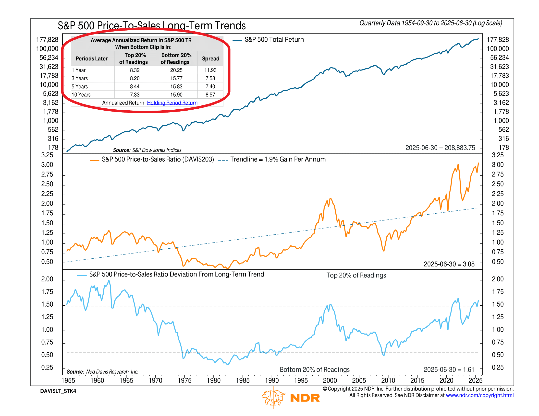 But this second chart adds some perspective. Historically, the best returns come when valuations are low—when the Price-to-Sales ratio is cheap and stocks are “on sale.” This makes sense.
