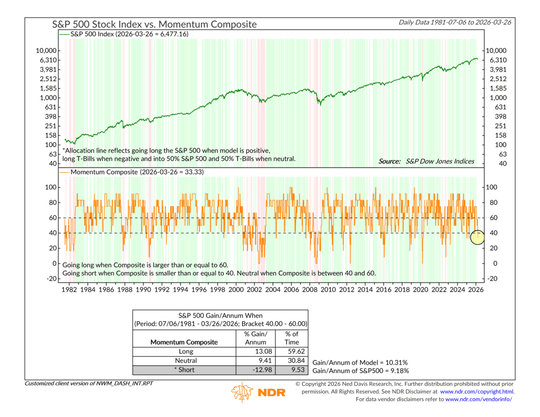 But here’s what makes this reading even more significant. The composite’s direction is falling — meaning the reading is lower today than it was six weeks ago. That matters quite a bit. When “Big Mo” is both below 56 and falling at the same time, the S&P 500 has historically averaged a loss of 17.24% per year. That covers roughly 14% of all time periods in the data going back to 1979. It’s not a perfect signal, but it is something worth taking seriously.