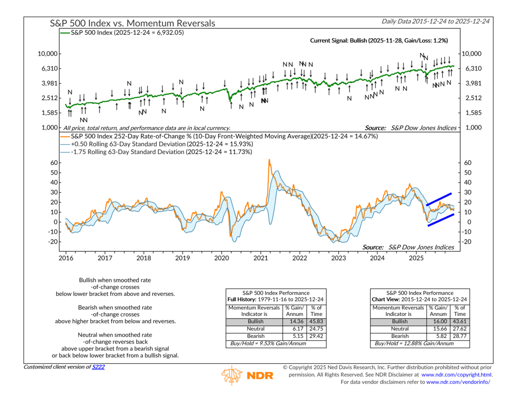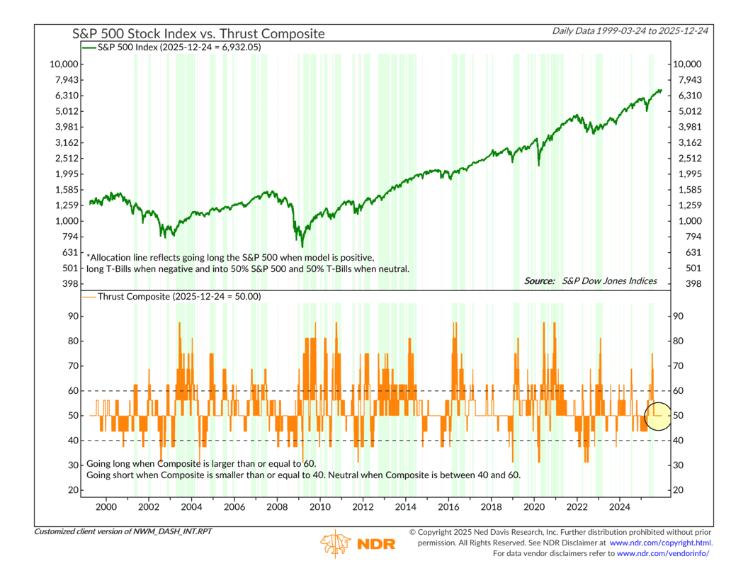 Take the volatility signal shown below. This indicator generates a bullish signal for stocks that lasts 20 trading days following a high but declining VIX reading. The most recent signal from late November has now expired, which leaves the volatility component sitting in a low-neutral position rather than actively supportive.