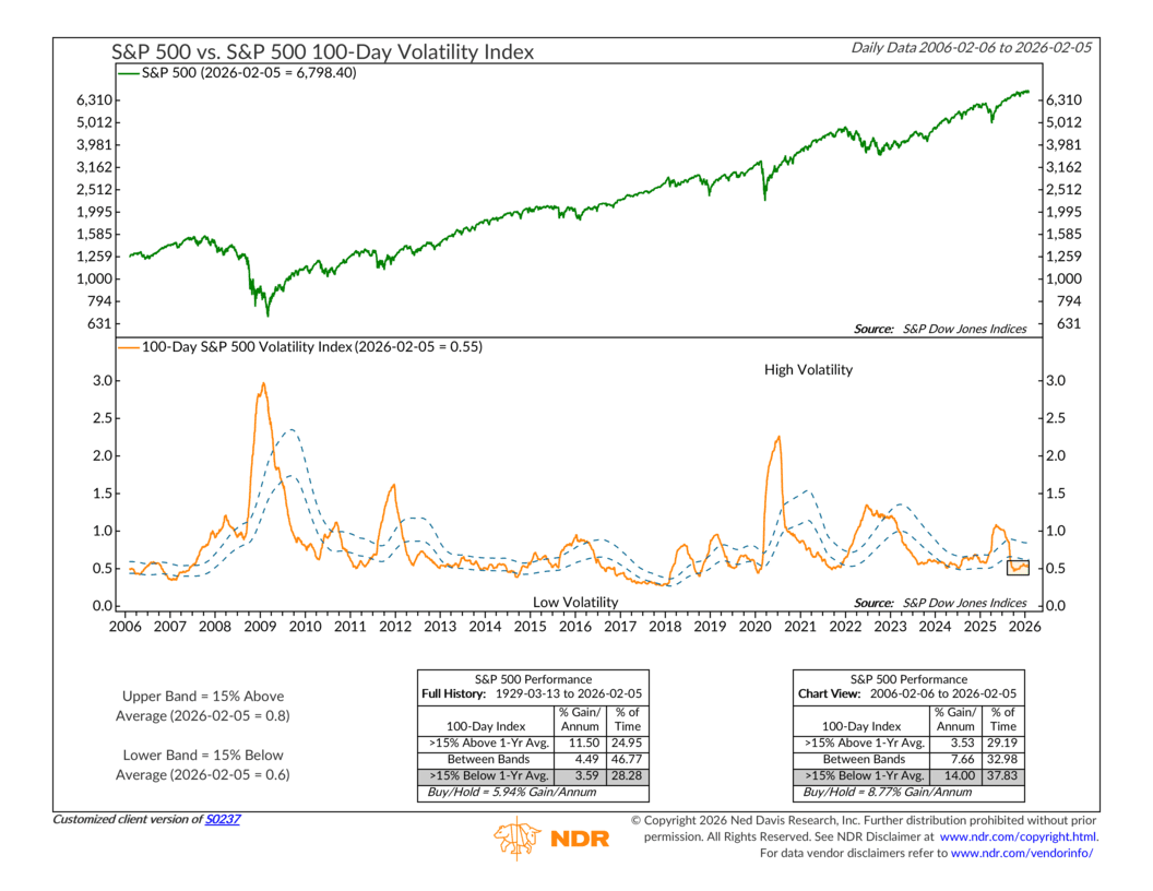 However, I will note that over the past 20 years, the performance breakdown has actually been opposite for this indicator. Low 100-day volatility has actually corresponded with better markets returns, which does line up with what we’ve experienced for the broader market. Sure, some sectors have gotten hammered recently, but like I said previously, overall, the S&P 500 is doing relatively well.