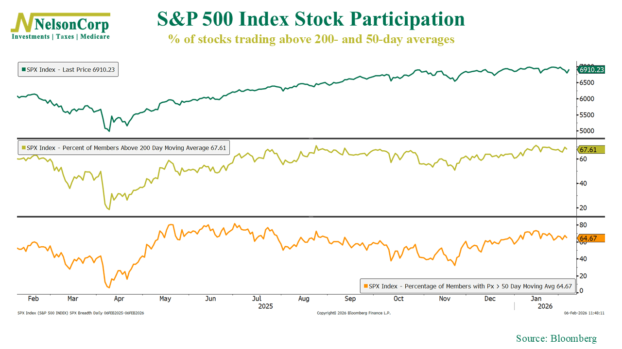 Leadership continued to favor value over growth. Russell 3000 Value gained 2.24%, while growth fell 1.84%. Mid- and small-cap stocks were standouts, with the S&P 400 up 4.36% and the S&P 600 higher by 3.95%. Large-cap growth remained under pressure, with the S&P 100 down 0.58%.