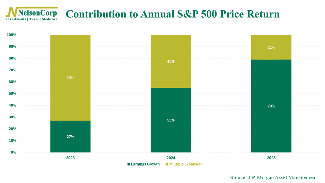 As the chart below shows, roughly 79% of the S&P 500’s gain this year has come from earnings growth, or corporate profitability, versus just 21% from multiple expansion, which reflects what investors are willing to pay. Last year, earnings accounted for only about half of the gain, and the year before that, just 27%.