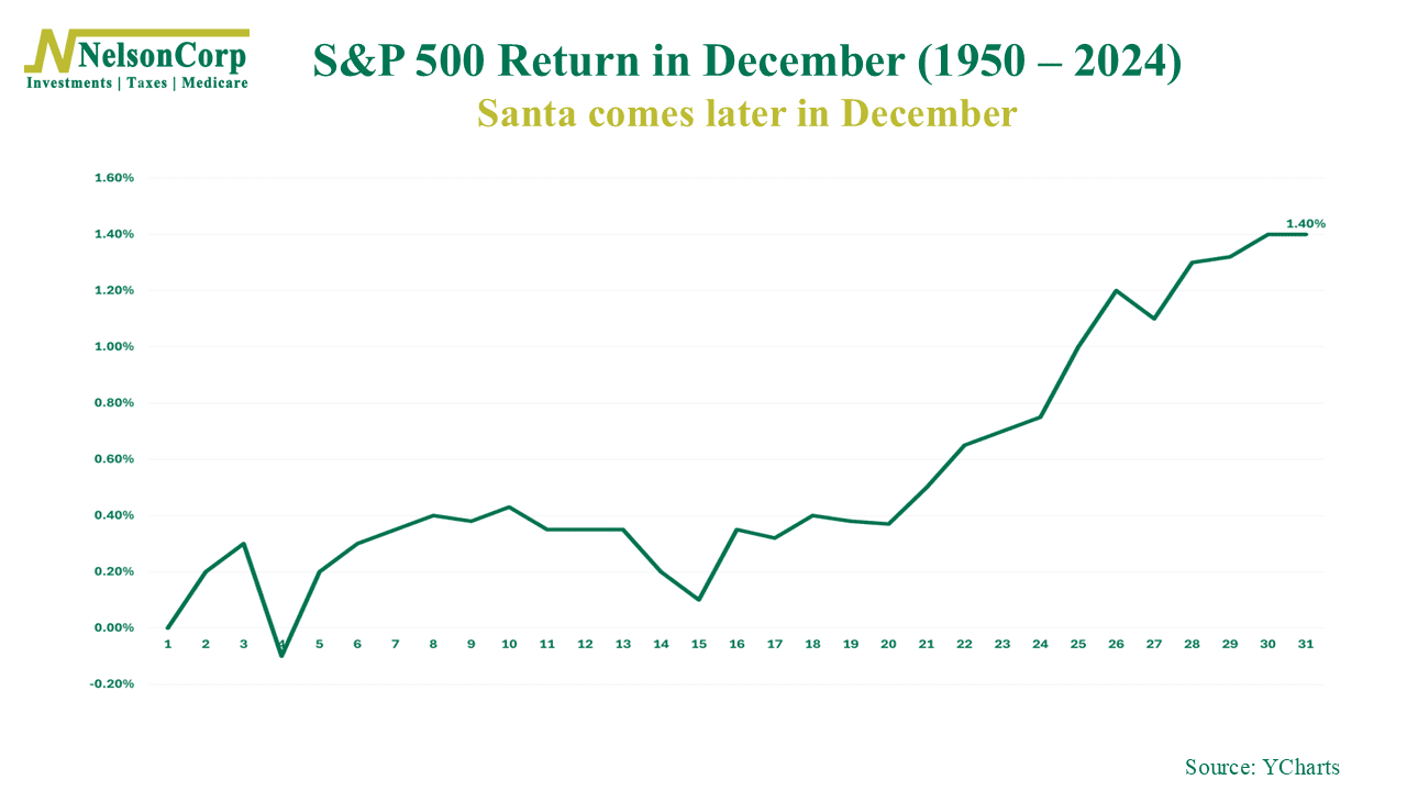 From a seasonal standpoint, the odds are supportive. Historically, the second half of December has tended to be a strong period for stocks, often referred to as the Santa Claus rally.