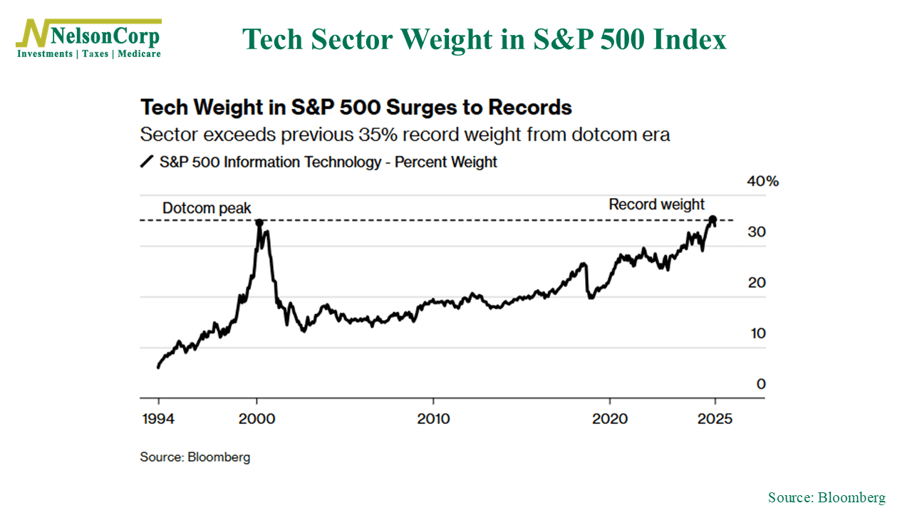 That’s good news. It means companies are doing what they’re supposed to do, earning profits. Of course, a large share of those profits has come from a relatively small group of mega-cap stocks. As the next chart shows, the tech sector’s weight in the S&P 500 has climbed to a record above 35% this year, surpassing even the dot-com era.
