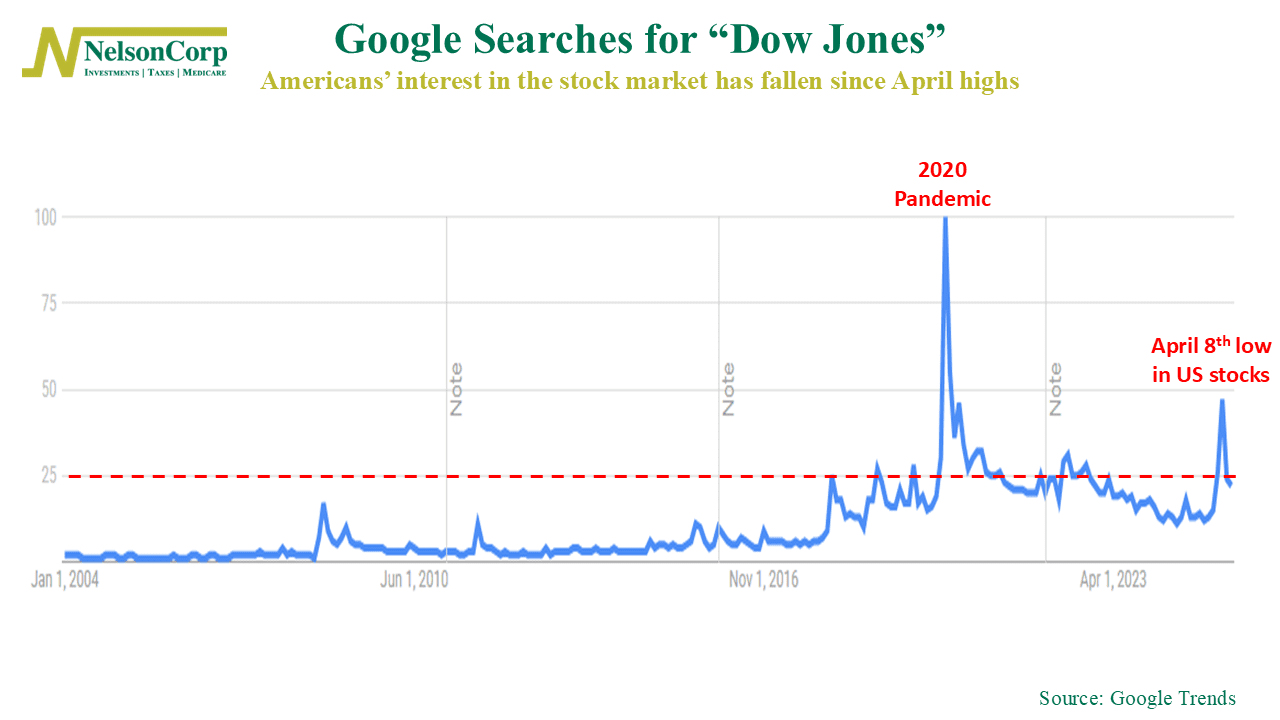 The good news? It’s since fallen back down to around 22. That means people are searching for the Dow at about 22% of the rate they were during peak pandemic fear. Still elevated, but toward the low end of the five-year range.