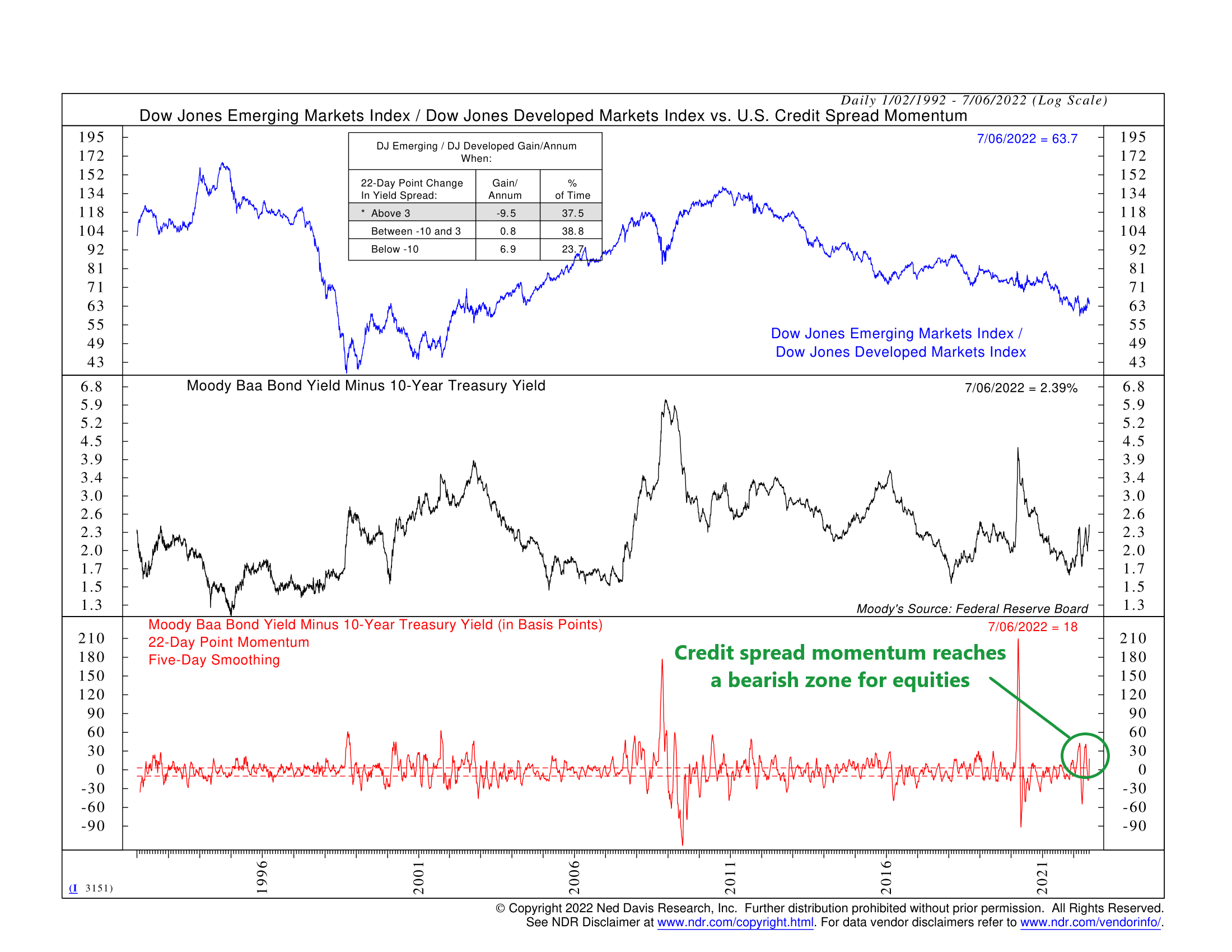 To put more meat on the bones, this indicator also calculates the 22-day (1-month) change in the credit spread in basis points. This is shown as the red line on the bottom clip of the chart. When this measure spikes, it’s a sign that investors’ tolerance for risk is falling. In this type of environment, other risk assets—like stocks—also tend to suffer.